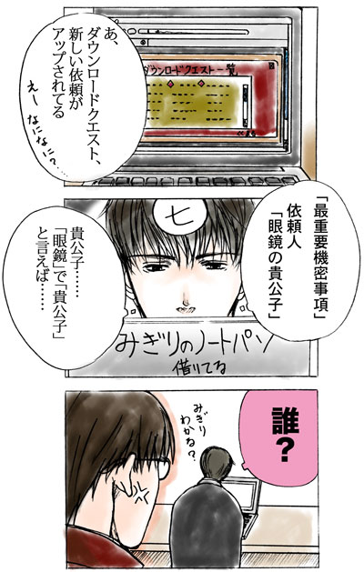| 鬼祓師3コマ漫画 「七代くんと鹿島くん〜クエスト依頼〜」 (画像クリックで拡大画像が別窓で開きます) |